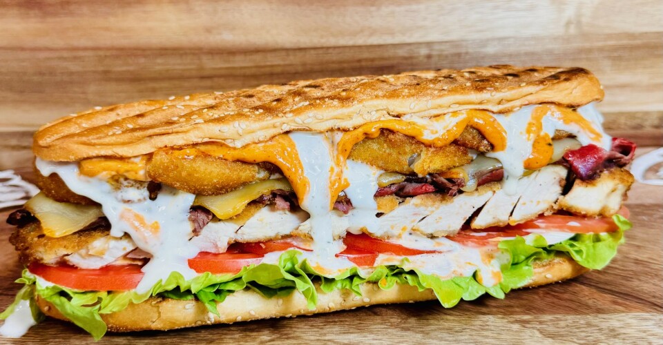 Turkey, Ham & melted Swiss with Lettuce, Tomato, Onion & Russian dressing on a toasted Hero